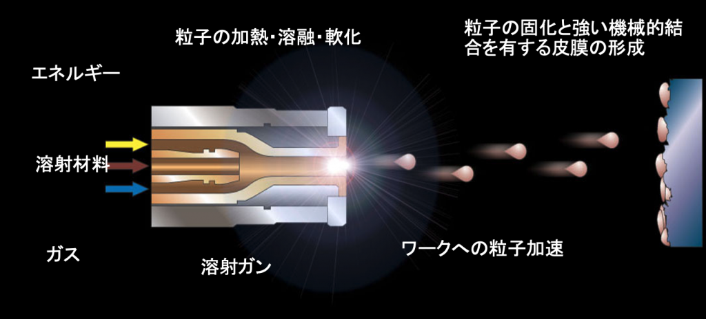 HVOF溶射とは金属、合金などの材料を可燃性混合ガスの熱源を利用し溶解させ、マッハ2~3の超高速で吹きつけ金属皮膜を形成させるドライコーティング技術です。溶解金属が高速で噴射・加速されるため 従来のプラズマ溶射に比べ非常に緻密で密着性に優れた皮膜が短時間で形成されます。 また、粉末状の金属材料をかえるだけで亜鉛のような柔らかい金属やコバルト、タングステン・ カーバイトのような硬い金属の皮膜を作ることが可能となります。 現在では航空機産業、宇宙ロケット、自動車をはじめ産業機器の部品に幅広く採用されています。